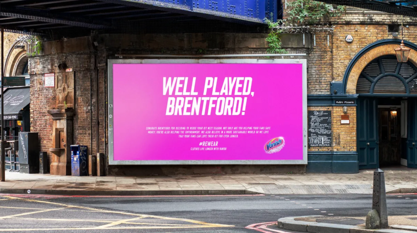 Vanish is celebrating this and encouraging rewear, care and reuse of clothing with tactical OOH created by Havas London – going live at sites around the stadium, on the eve of Brentford FC’s home game against Chelsea. ‘Bees are good for the environment’ is a play on words that gives a shoutout to the football club for taking on this sustainable stand and cheering on fans for rewearing.